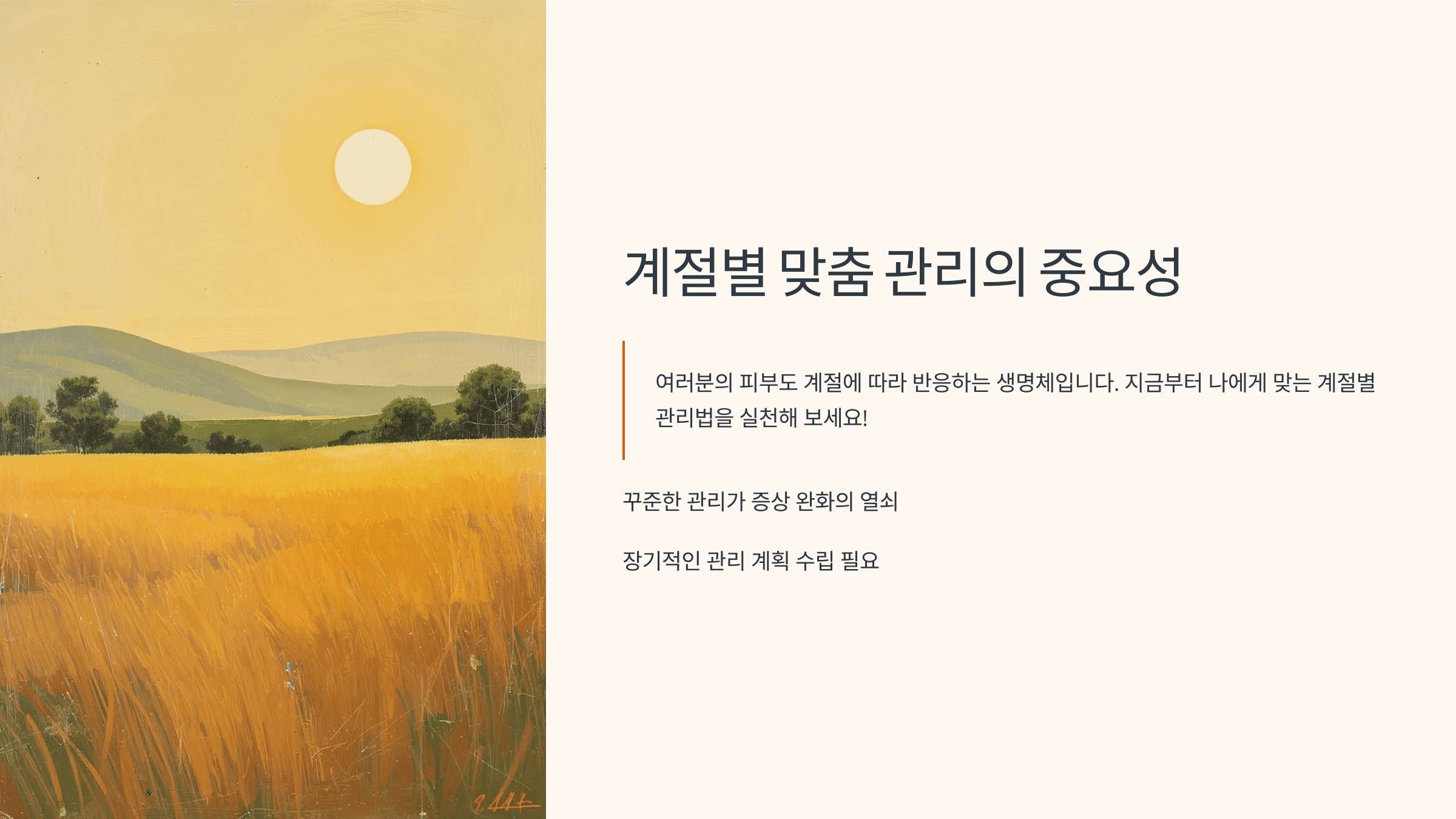 계절은 우리가 통제할 수 없지만, 아토피에 대한 반응은 충분히 조절할 수 있습니다. 계절마다 변하는 환경 요소를 이해하고, 그에 맞는 생활습관과 피부 관리법을 실천하는 것이 증상 완화의 열쇠입니다. 특히 아토피는 꾸준한 관리가 가장 중요하므로, 단기적인 개선보다는 장기적인 관리 계획을 세워야 합니다. 여러분의 피부도 계절에 따라 반응하는 생명체입니다. 지금부터 나에게 맞는 계절별 관리법을 실천해 보세요! 🌿