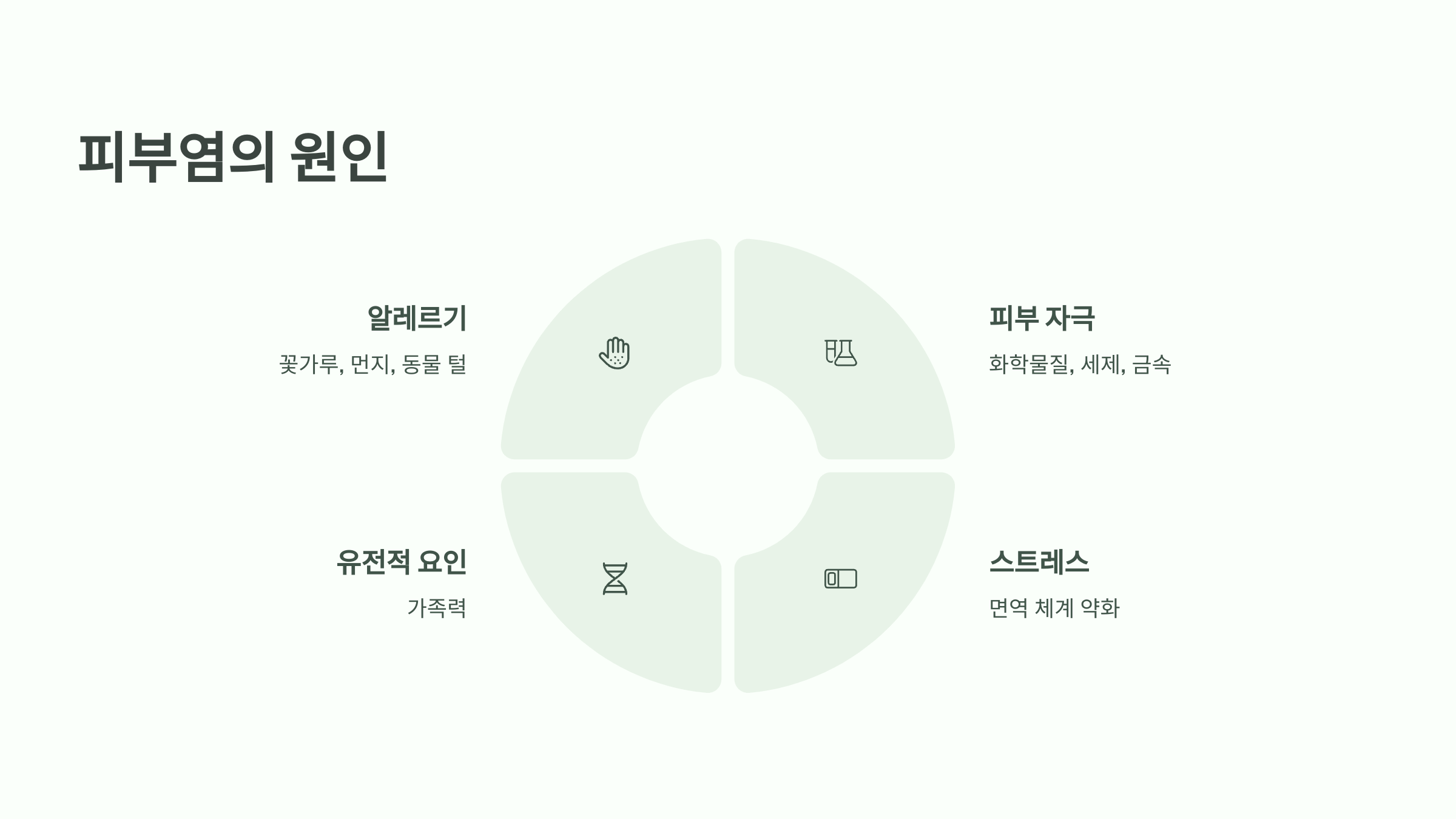 피부염은 여러 가지 요인이 복합적으로 작용하여 발생합니다. 아래 원인들을 잘 파악하여 자신에게 해당되는 부분을 관리하는 것이 중요합니다: