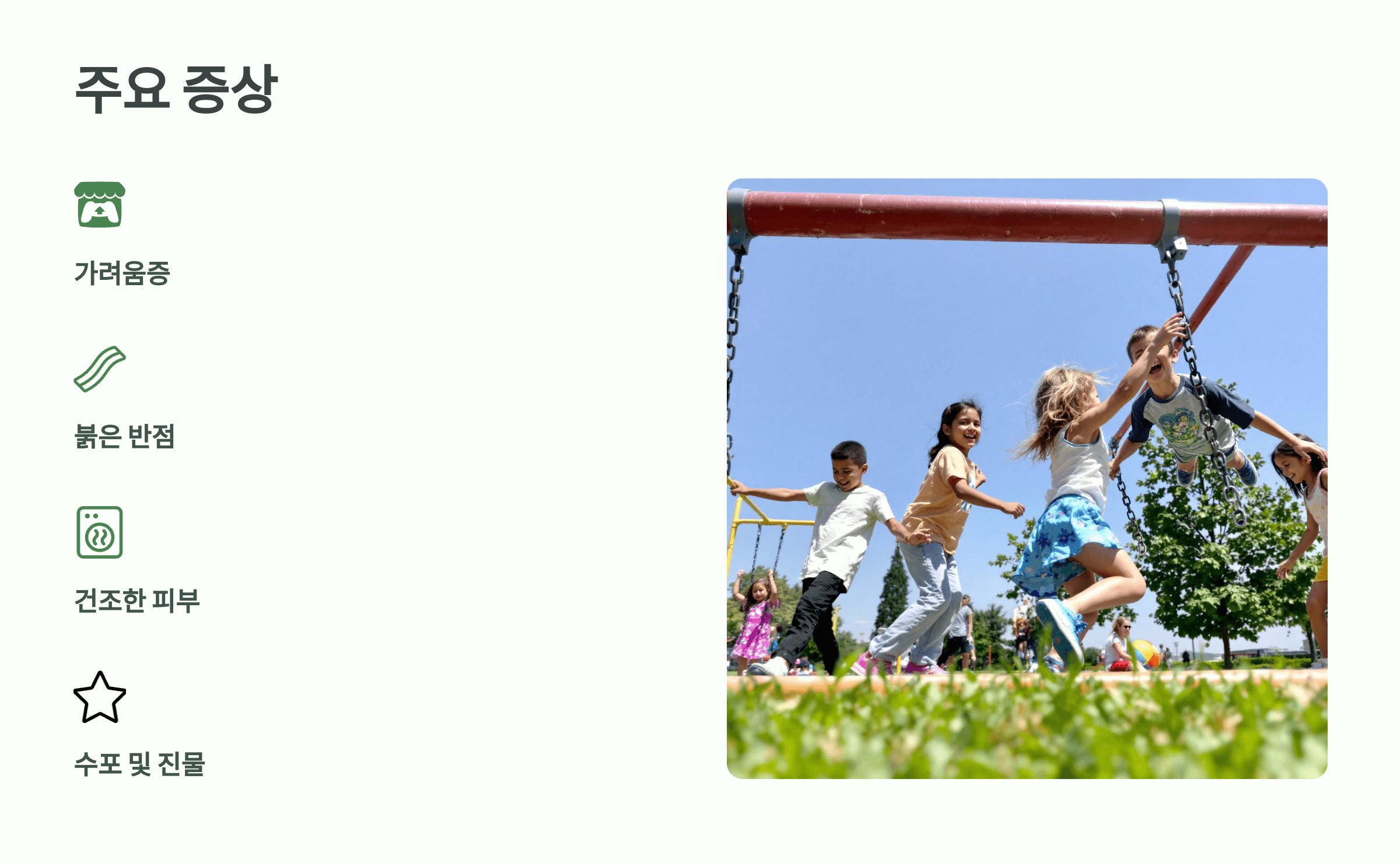 - 습진: 여러 피부염을 포함하는 총칭으로, 급성기에는 수포, 진물, 가려움증이 동반되고 만성기에는 피부가 두꺼워지며 갈라지기도 합니다.