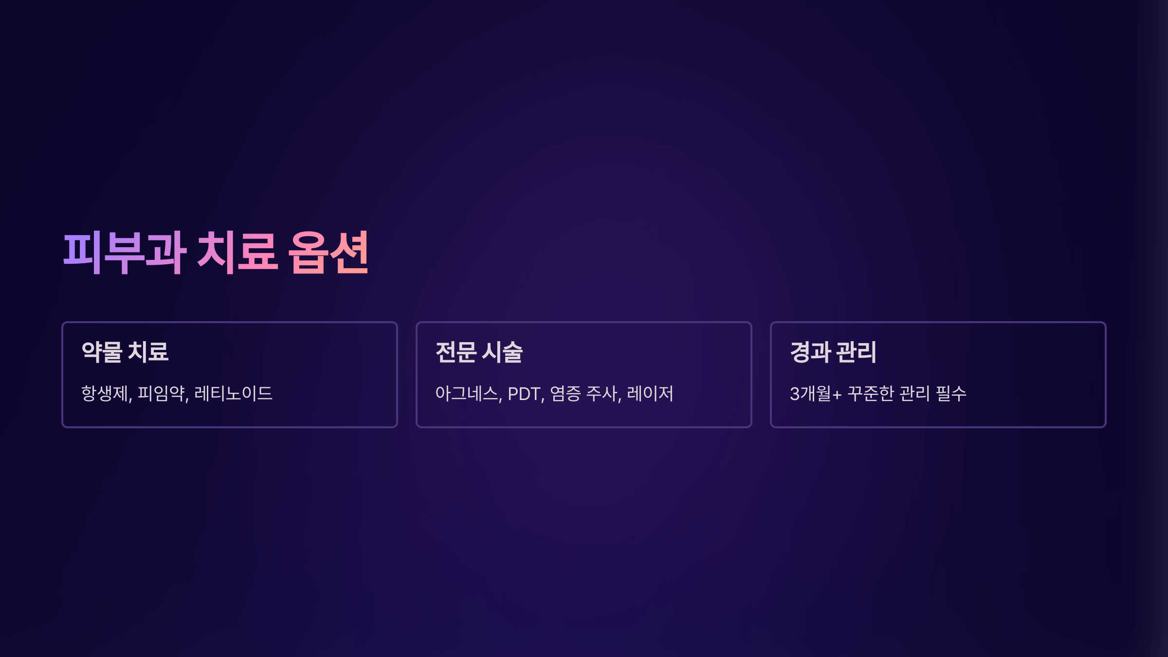 - 경구 항생제, 피임약(여성), 레티노이드 계열 등이 선택 가능