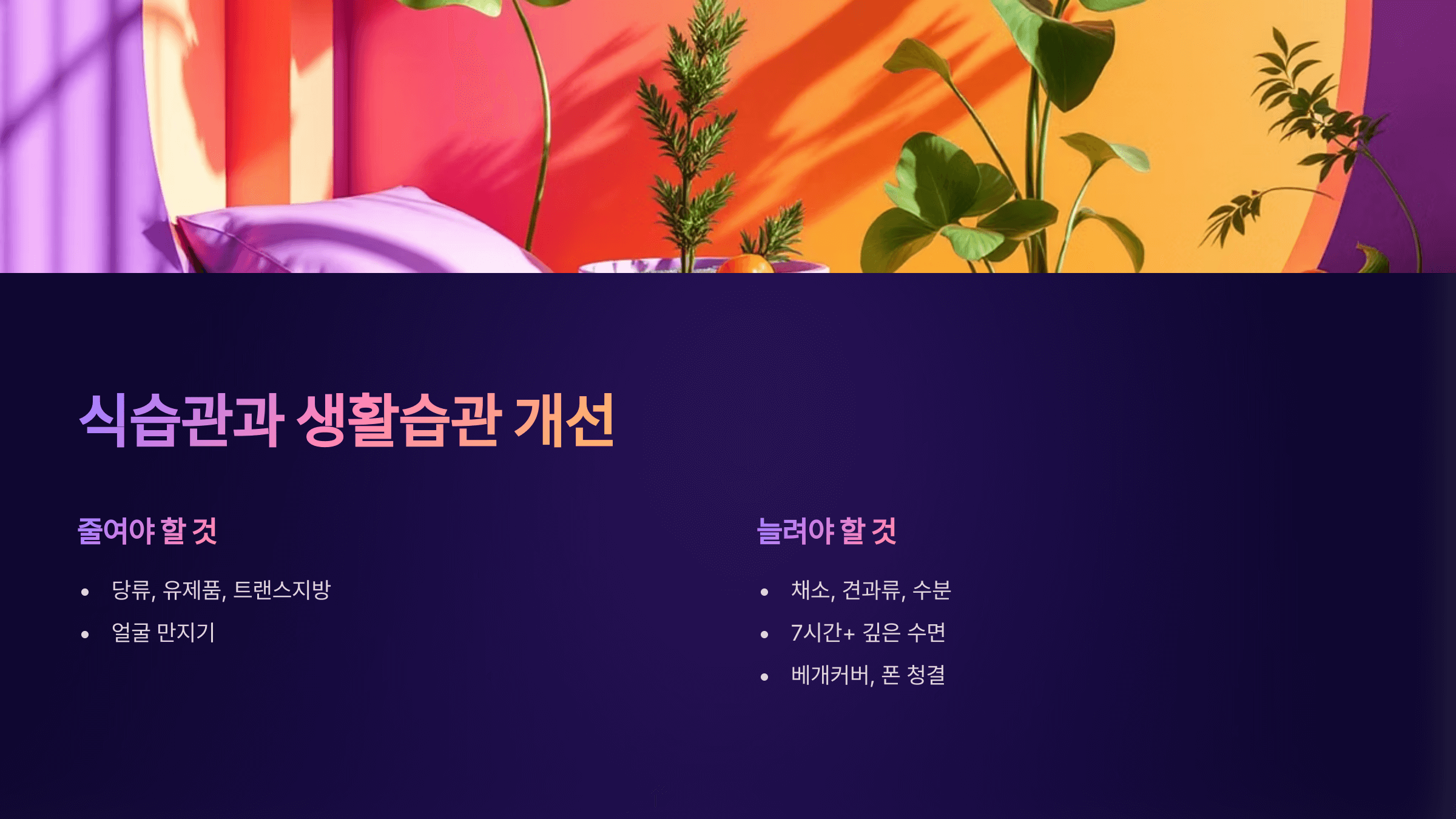 - 하루 7시간 이상 깊은 수면이 호르몬 균형과 피부 재생에 필수